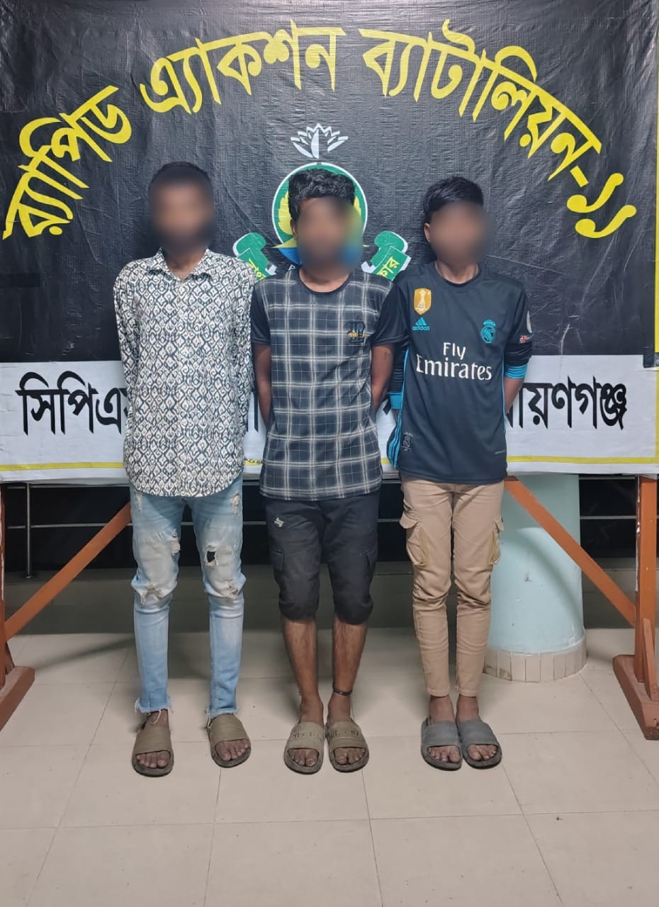 ঢাকা-চট্টগ্রাম মহাসড়কে র‍্যাব-১১ এর সাঁড়াশি অভিযানে দেশীয় অস্ত্রসহ ০৩ জন ছিনতাইকারী গ্রেফত।